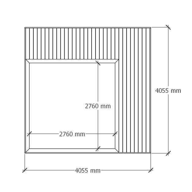 Decking board by selection treated wood 28x120 mm or thermowood 26x117 mm, with hidden fastening from the side of the decking board.