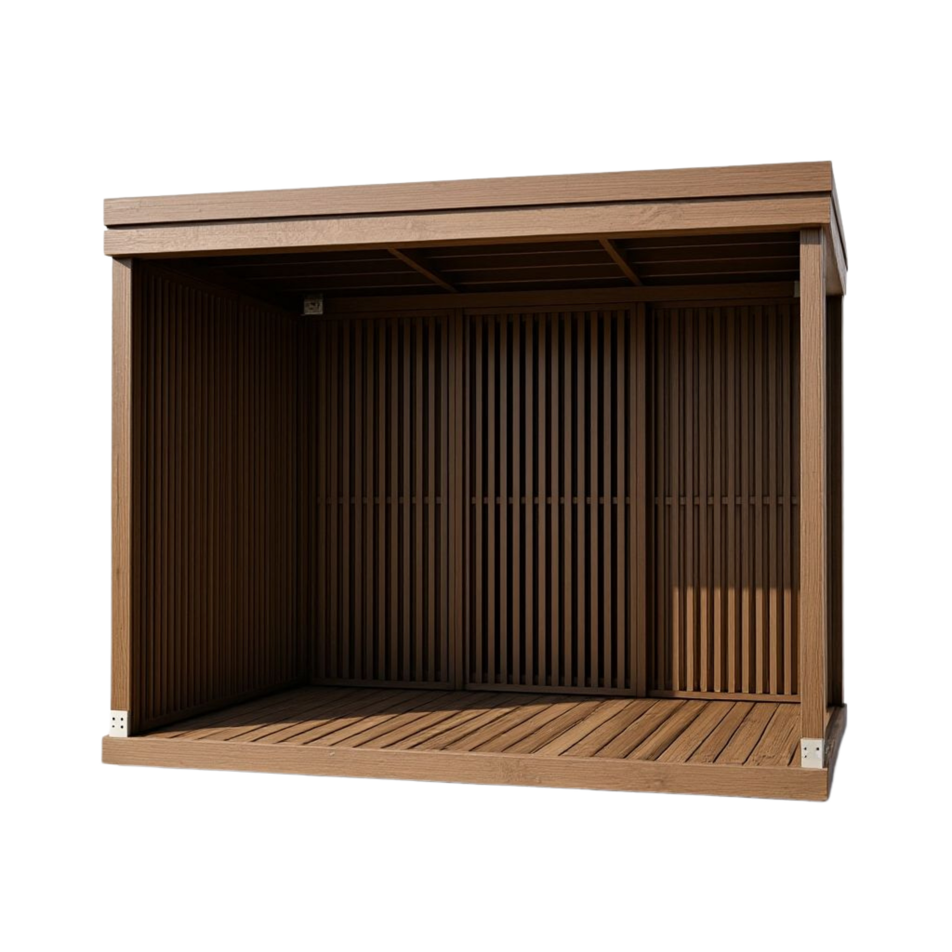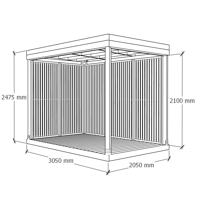 The delivery set includes deck modules, wall modules, roof modules, beams, posts, trims and fasteners. Adjustable deck feet can be added to the shopping cart.