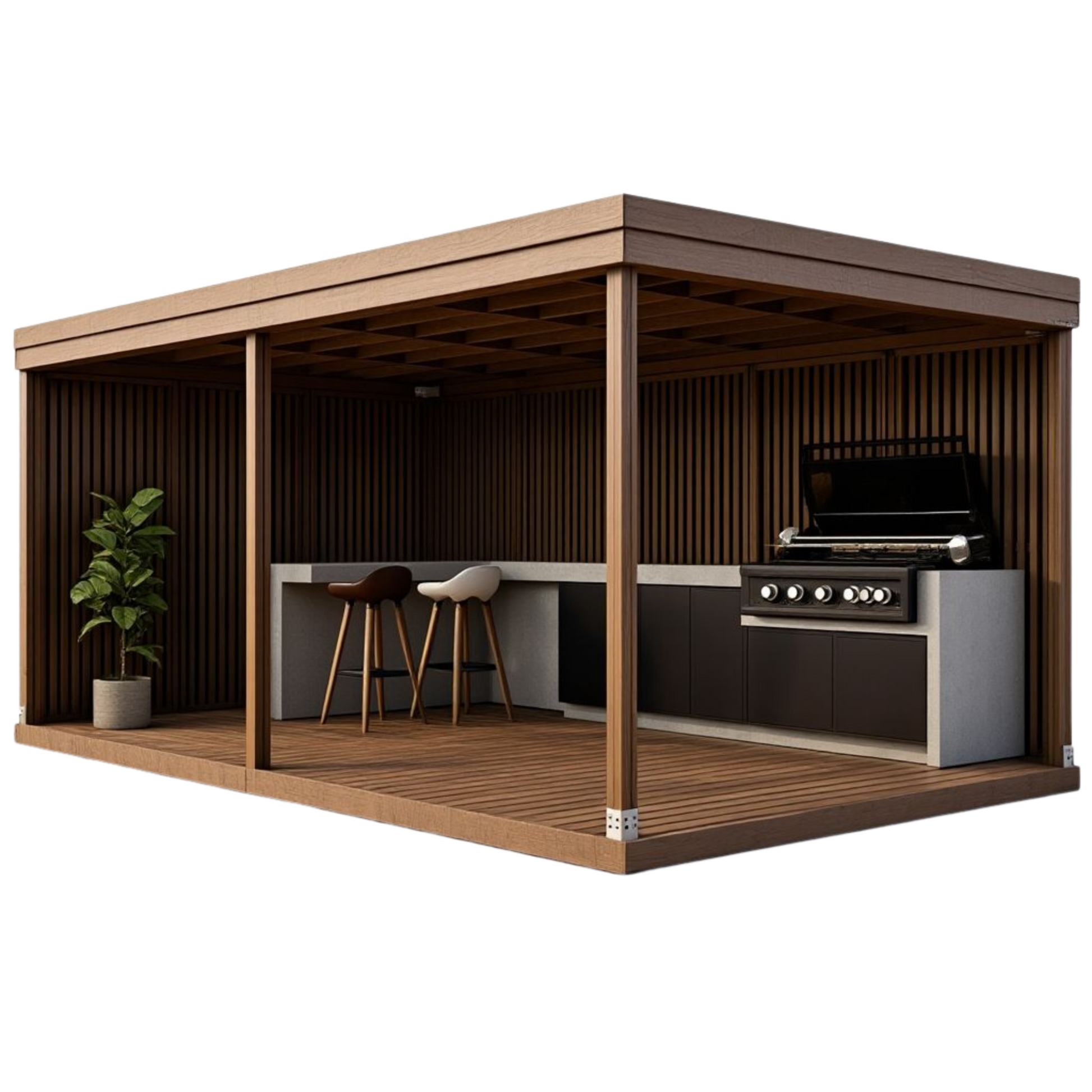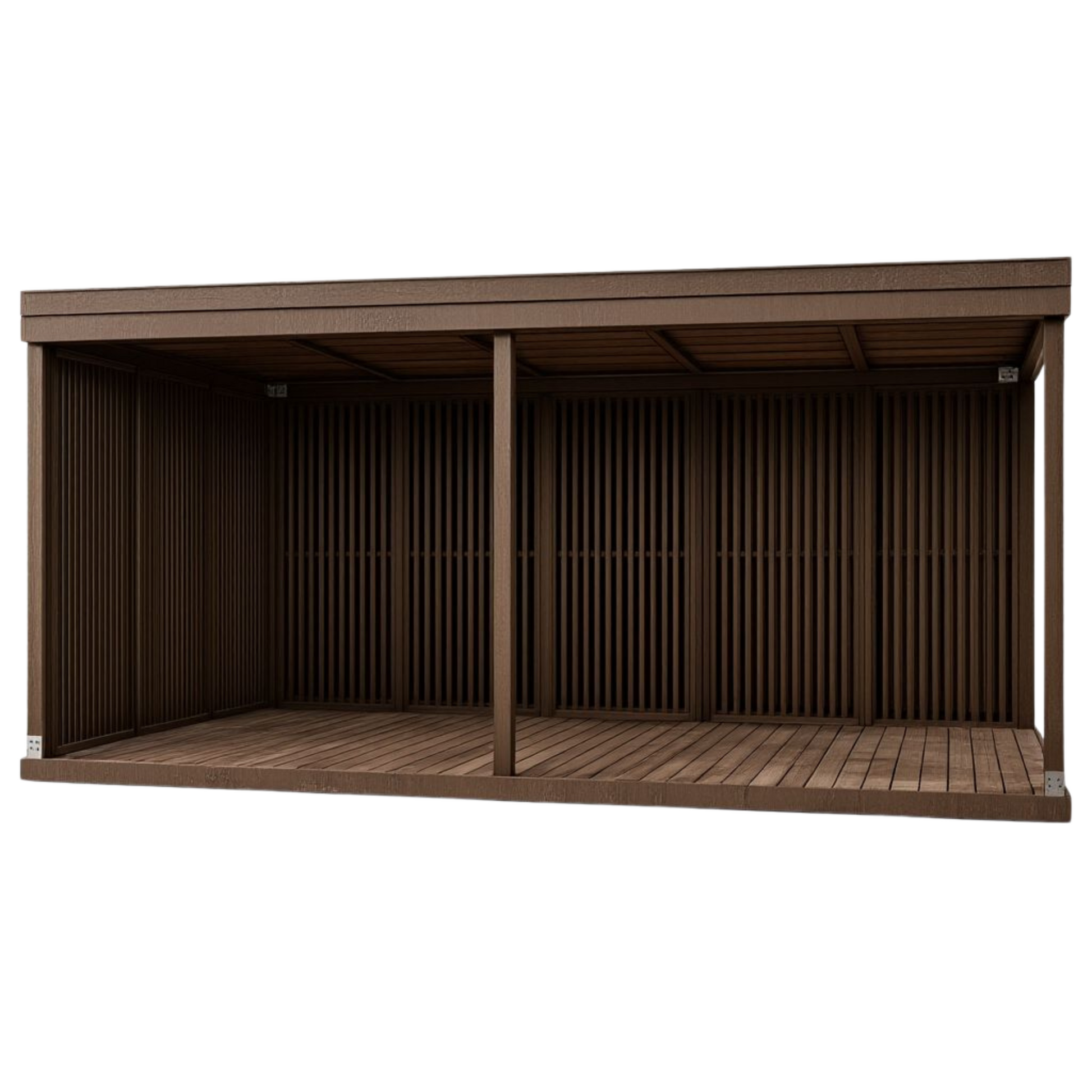 The delivery set includes deck modules, wall modules, roof modules, beams, posts, trims and fasteners. Adjustable deck feet can be added to the shopping cart.