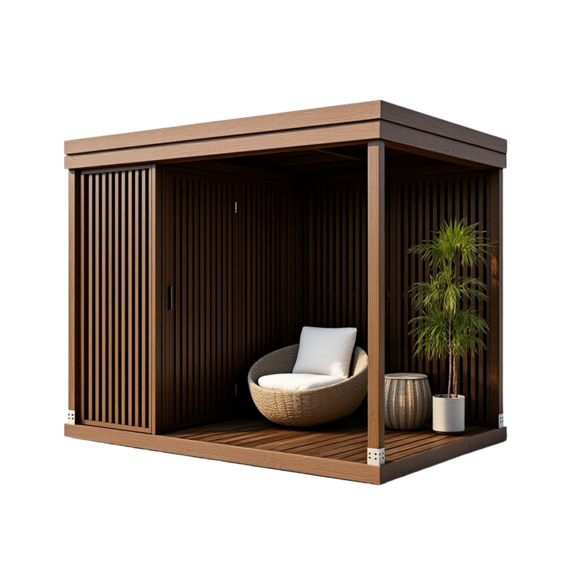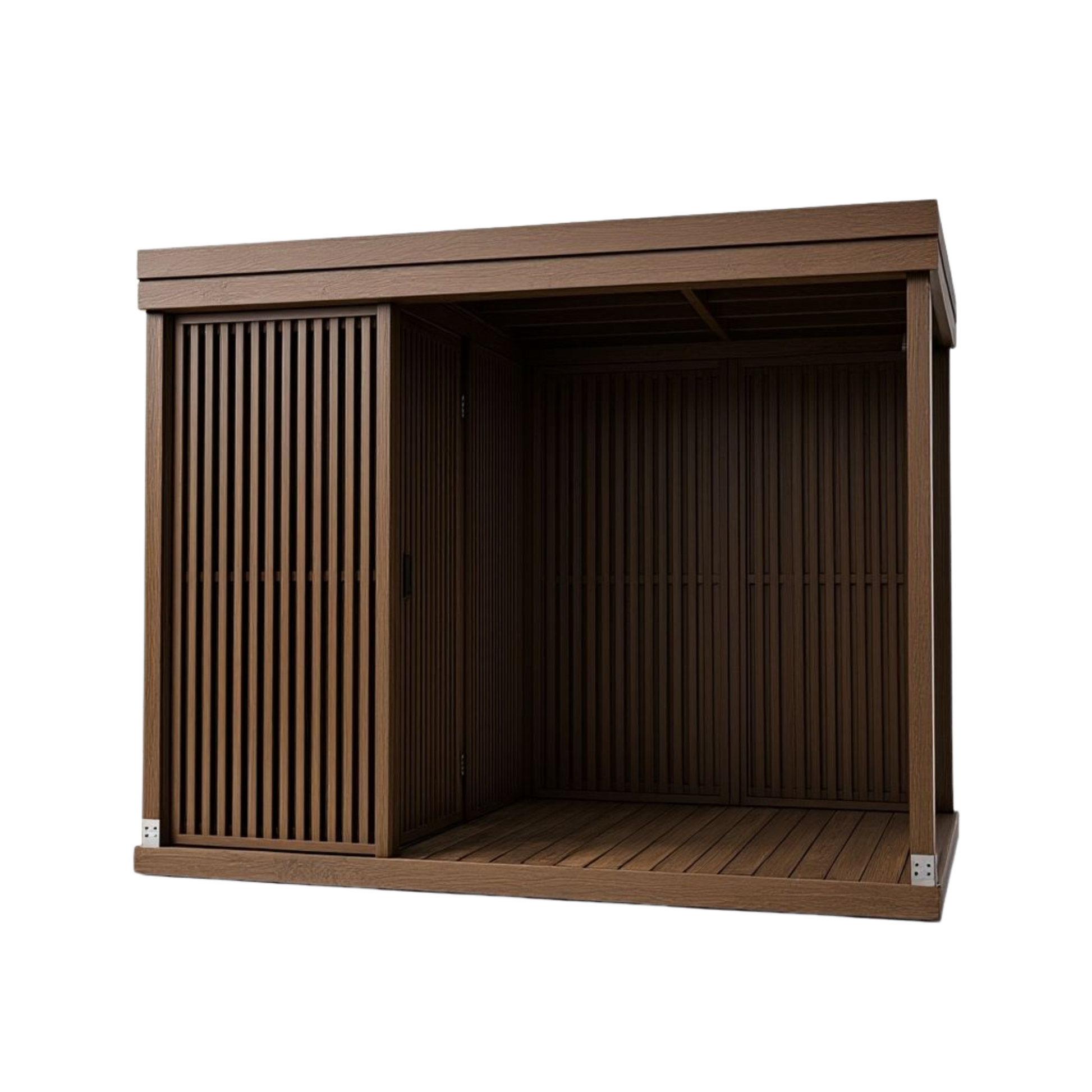The delivery set includes deck modules, wall modules, roof modules, door module, beams, posts, trims and fasteners. Adjustable deck feet can be added to the shopping cart.