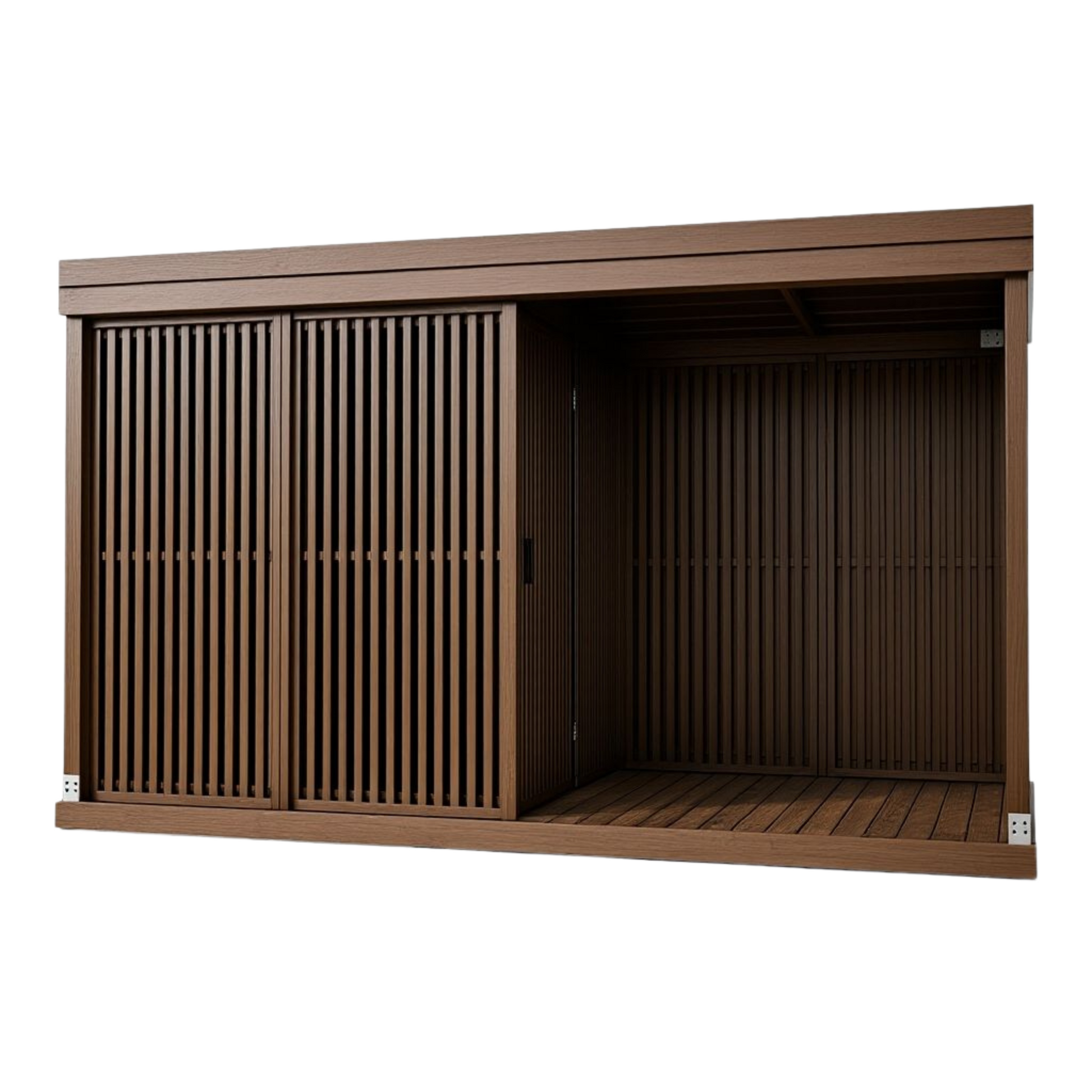 The delivery set includes deck modules, wall modules, roof modules, door module, beams, posts, trims and fasteners.