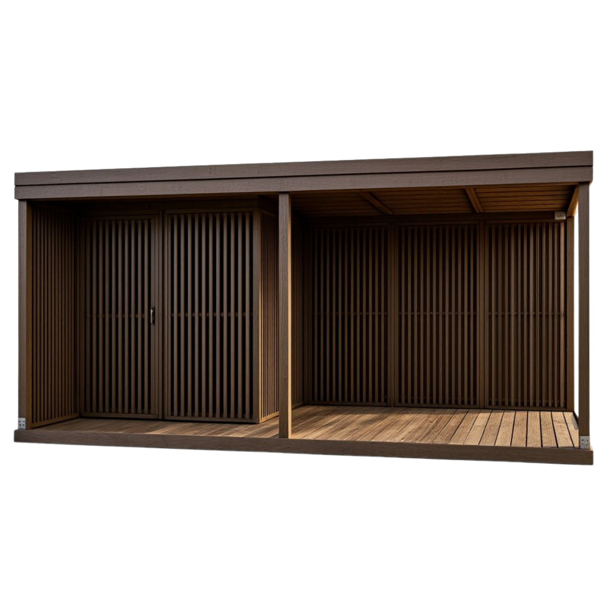 The delivery set includes deck modules, wall modules, roof modules, door module, beams, posts, trims and fasteners.